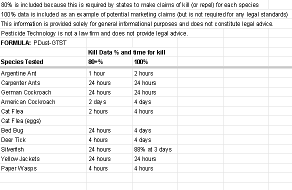 Kill Claims supported by Data: Ticks (nymph and adult), Deer Ticks (nymph and adult), Cat fleas (larvae and adult), Bed Bugs (instar and adults)